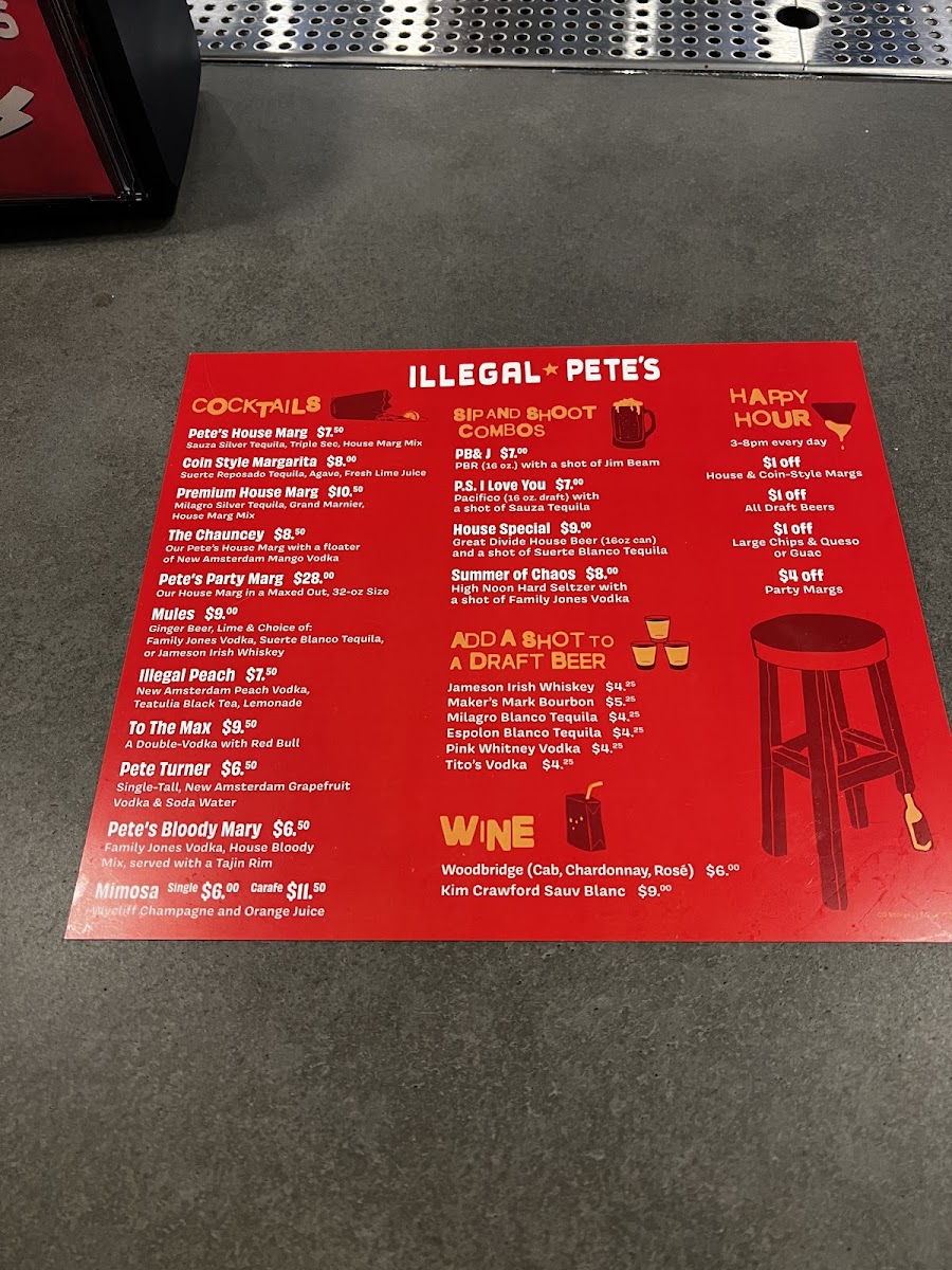 Illegal Pete's also shines in the drink department. The house margaritas, famously crafted by the friendly bartenders, have received numerous accolades. On happy hour days, these drinks are even more enticing, as Kaitlyn Rose discovered on her opening day visit. The marriage of these cocktails with plates of freshly grilled asada or crispy fish tacos makes for a truly enjoyable meal.